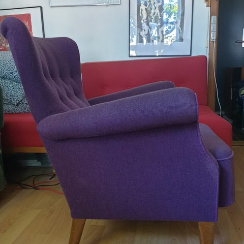 Den ligner en Fritz Hansen lænestol, men er ikke stemplet. Den kunne også være fra Slagelse Møbelværk.