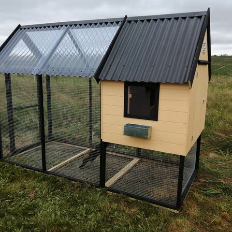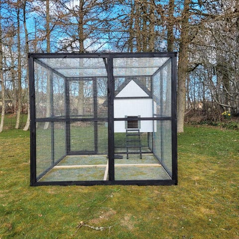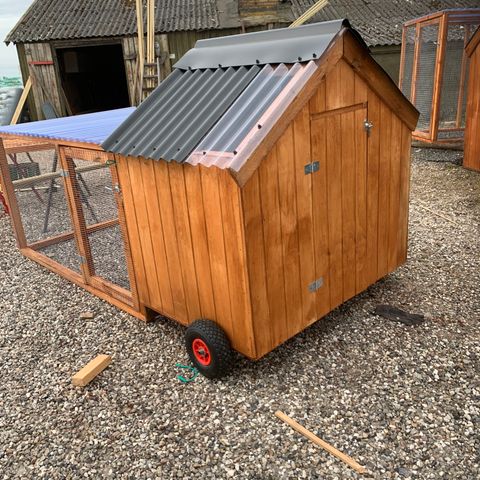 Hønsehus, 5 stk., Trænger til en gang højtryksrensning. Alle er med hjul og aksler (nogle af billederne er dog uden, men akslerne hører med)