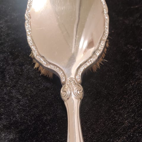 Håbørstesæt, Bronce, 100 år gl., Et meget elegant toilette-sæt bestående af fem dele: 2 hårbørster, spejl, klædebørste talkumbeholder i bronce fra 1920erne.Facetslebet spejl.