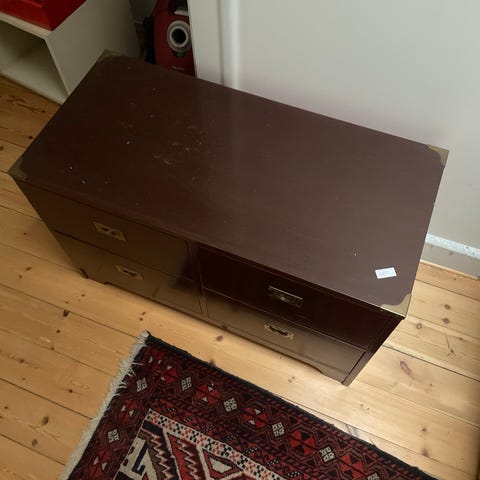 Skænk, b: 145 d: 47 h: 70, Skænken er generelt i pæn stand. Kanten på lågerne er dog gulnet, se det ene billede.