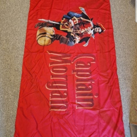 Meget stort banner i plastik med småbitte huller, så vinden kan suse igennem og metalringe i siderne til ophæng.
