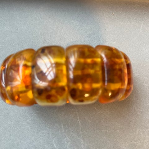 Et sæt rav bestående af et armbånd, to par øreringe og en broch .Armbåndet måler 19 cm