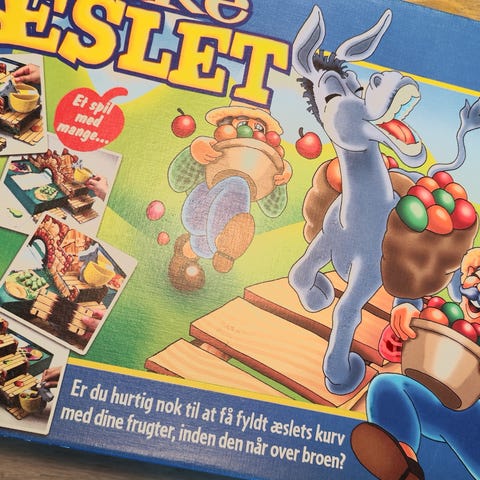 Pakke æslet, Familiespil , brætspil, Komplet. Broen fremstår med noget slid på bakketoppen - resten af indholdet er i fin stand. Låget er meget slidt