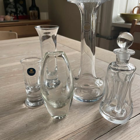 3) Lille blå vase i klar blå glas. Aldrig brugt. Pris 20,-