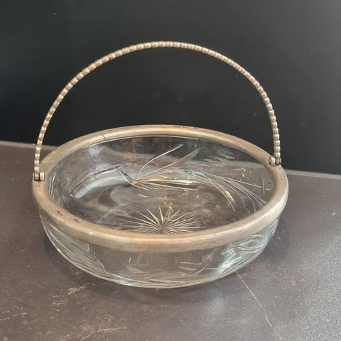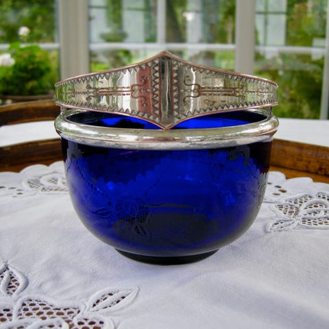 Fin kandisskål i koboltblåt glas med forniklet rand og håndtag i messing.