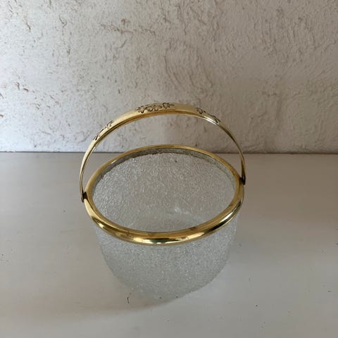 Denne måler 8 cm i højden og cirka 11,5 cm over åbningen. Fornikling på messing-håndtag og rand er delvist slidt - men overordnet fremstår den i fin stand uden skader.