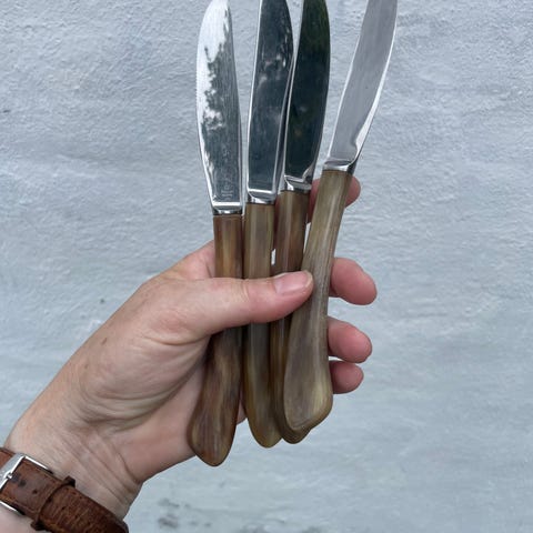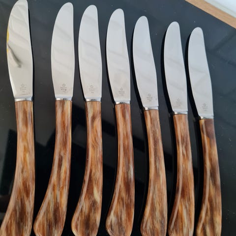 3) 6 Raadvad knive med skaft af brun ben á 50,-/stk.