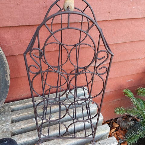 Vinreol, Flot vintage vinreol udført i smedejern i fransk rustik stil med perfekte patina. Reolen har plads til 6 flasker, hvor vinen bevarer sin smag gennem den horisontale opbevaring og vinpropperne forbliver fugtige og bliver ikke porøse. Reolen med håndtag, så den nemt kan flyttes rundt. Kan klappes sammen. Mål: B: 34 cm. D: 6 cm. H: 30/34,5 cm.