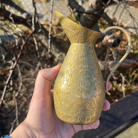 Charmerende antik kaffekande i messing med porcelæns håndtag samt top på låget