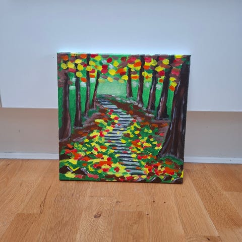 Flot maleri af solnedgang i skov. Træramme medfølger men ikke monteret. Det er ikke lykkedes os at fastslå hvem kunstner er. Både ramme og maleri fremstår i ok stand. Kan ikke sendes.