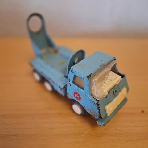 @ Fin gammel lastbil af blik med tip lad. Stemplet Made in Japan i bunden. Måske noget til modelsamlingen. Fremstår i ok stand med få brugsspor.