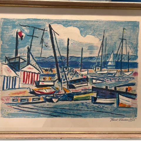 Tryk, Karl Larsen, b: 36 h: 48, Karl Larsens gennembrud maleri her som tryk, trappeopgang eller violinspiller i trappeopgang, nyindrammet med passepartout