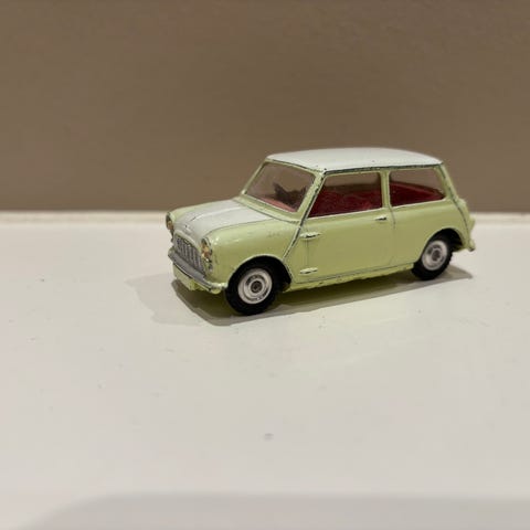 no.1. Corgi Toys 227 Morris Mini-Cooper Competition cremfarvet med hvid tag og flag på kølerhjelm har no. 3 på døren