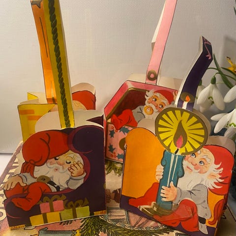 7 stk juletræspynt i karton og stof. 11-15 cm høje.