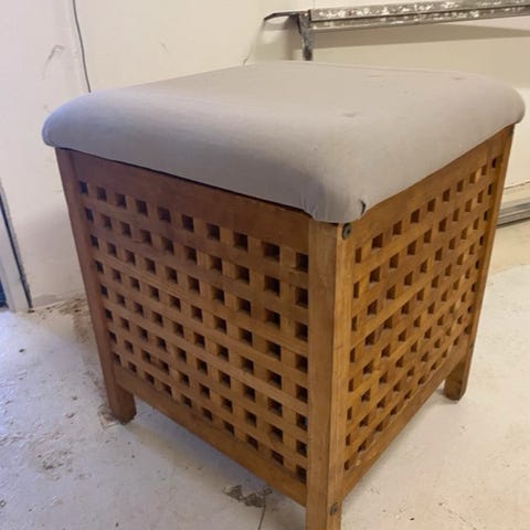 Stof betrukket og med polstret top, så den er behagelig at sidde på. Ydre mål: 71x34x48 cm (BxDxH). Ingen skader på stoffet.