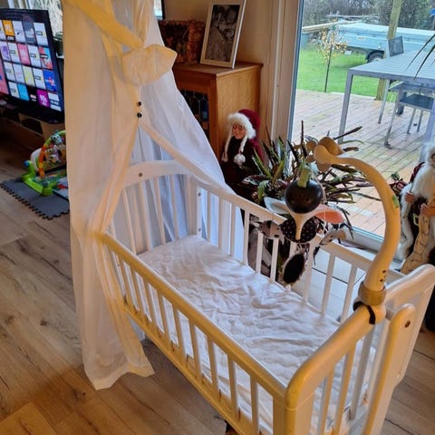 Inkl. sengerand, himmel, madras - dog er madrassen købt separat, derfor passer ikke helt til sengen, men fejler intet.
