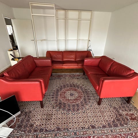 Det er en møbelgruppe der består af to stole, en trepersoners sofa og et bord.
