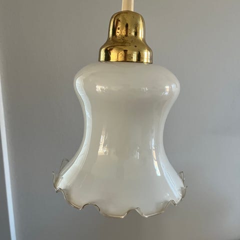 Pendel, Opaline pendel med perleskørt, Super fin bemalet opaline pendel med perleskørt - og messing/bakelit topdel/fatning. I god stand for alder - der er sat ny snoet stofledning i beige i.