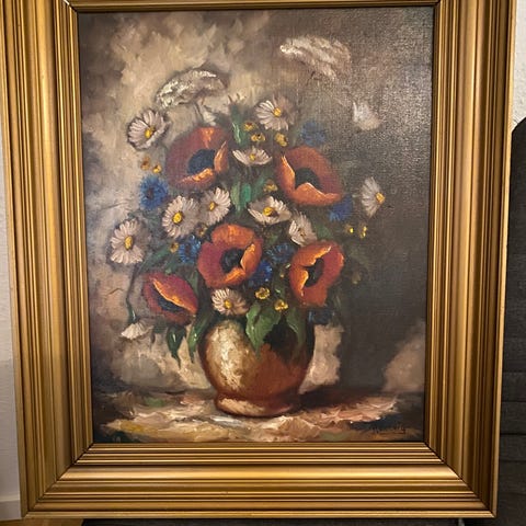Oliemaleri, Ahlmann, motiv: Blomster/Have, stil: Realisme, b: 34 h: 47, Oliemaleri af blomster signeret Ahlmann. Billedet er af ældre dato og sælges derfor som det er. Billede og ramme er i fin stand.
