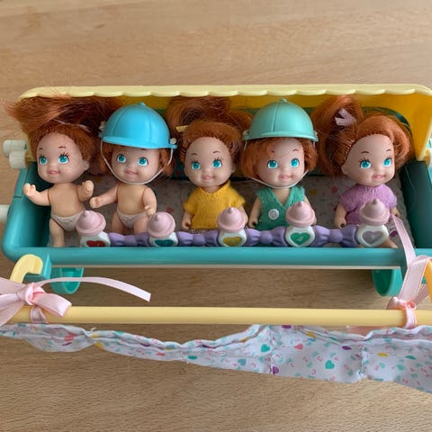 Dukkerne er fra 90’erne og er blevet leget med, der mangler fx et par knapper og en elastik - udover det der er vist på billederne er der en kasse med lidt blandet tilbehør