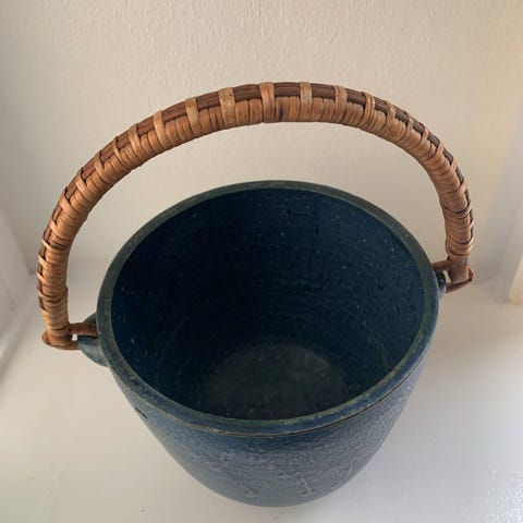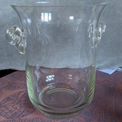 Designet tilskrives Jacob E Bang, men farven er nok snarer valgt af Per Lütken - vinkøleren er ydermere signeret, med "HOLMEGAARD 6273 B" - nok efter en ældre tegning, og bemærk, uden PL's monogram. Jeg gætter på at vinkøleren er fra 1953-4 - den går fint i spænd med isspanden med samme hank i bast. (Se sidste billede)