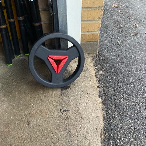 Vægtskiver, Vægtstang med skiver, Vægtstang med 12 tilhørende skiver på forskellig vægt. Der er 2 skiver på 10kg, 4 skiver på 5kg, 4 skiver på 2.5kg og 2 skiver på 1.25kg.