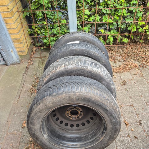 Gamle vinterdæk, fælge med dæk, Volvo 850 Volvo V70(1) m.fl. . 4 stk Goodyear UG 7 vinterdæk 195/65-15 på stålfælge, ca. 5mm mønster. 4 stk Toyo Observe G 15 Plus pigdæk 185/65-15 på stålfælge ca. 5 mm.mønster.pr. sæt
