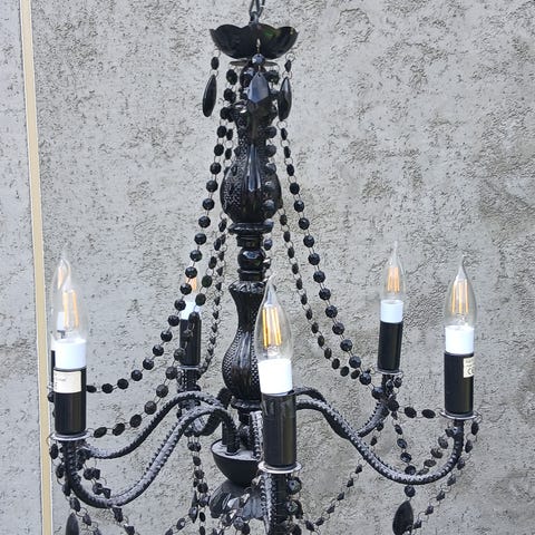 Lysekrone, Sort glad diamanter 5 arms lysekrone. Der medfølger en pose med masser af sorte glas diamanter til at sætte på, som gør den endnu mere luksuriøse og smuk.