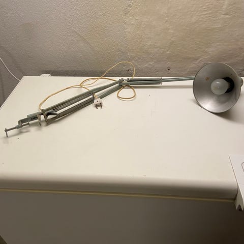 Arkitektlampe, HCF, Grå arkitekt lampe med holder til at skrue på bordet. Mærke HCF Er afprøvet og fundet virker. Fra ikke ryger hjem. Pæn stand, dog med aldersrelateret brugsspor. TJEK ALLE BILLEDER.