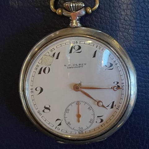 Lommeur, andet mærke, L.N. Strande, Lemvig. Lommeur fra ca. 1930. Har skader på skiven. Se billeder. Har et stempel 0,800 og flere andre indgraveringer. Virker meget fint. Familie arvestykke. Sølvsmed L.N.Strande fra Lemvig er registreret fra 1893 til 1937.