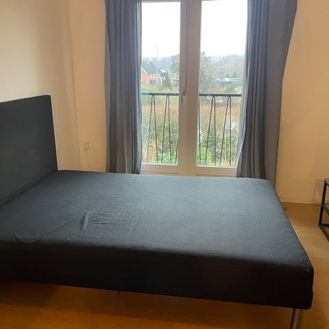 Dobbeltseng, b: 140 l: 200, Rigtig fin seng med flettet gavle og sort stålstel se billeder til boxmadras