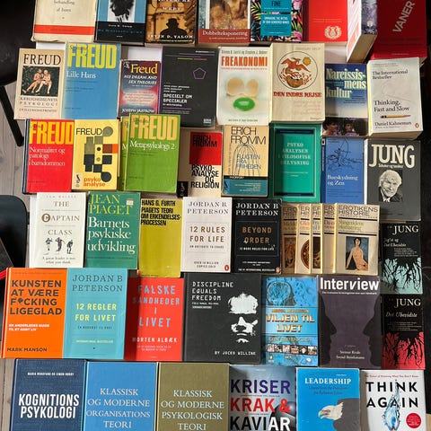 En masse forskellige psykologi bøger, dem på dansk er primært fra Hans Reitzels Forlag. Priser mellem 20 og 175 kr per stk.