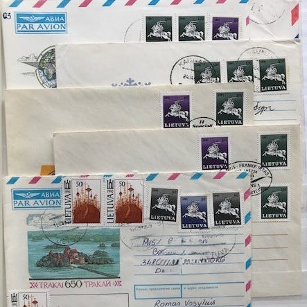 16-siders ny indstiksbog fuld af breve fra overgangstiden til selvstændighed med de tidligste udgaver på breve og kort, afklip fra helsagsporto, russisk helsag med litauisk porto, Hafnia udstillingsstempel osv., ialt over 100 forskellige. Stykpris pr. kuvert er under kr. 2,50 !