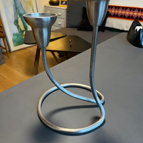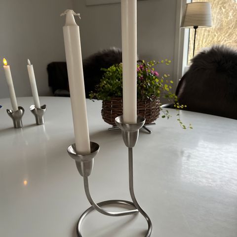 stage, Georg Jensen, lysestage - swing , stål. Intakt og fin stand. Skal pudses op. Den højeste er 22 cm og den mindre er 18 cm høj. 14 cm i diameter. Fra ikke ryger hjem. Afhentet eller plus 60 kr. til forsvarlig forpakning og forsendelse med tracking. Sender straks ved betaling og så er varen forventeligt fremme i løbet af 1-3 dage med tracking.