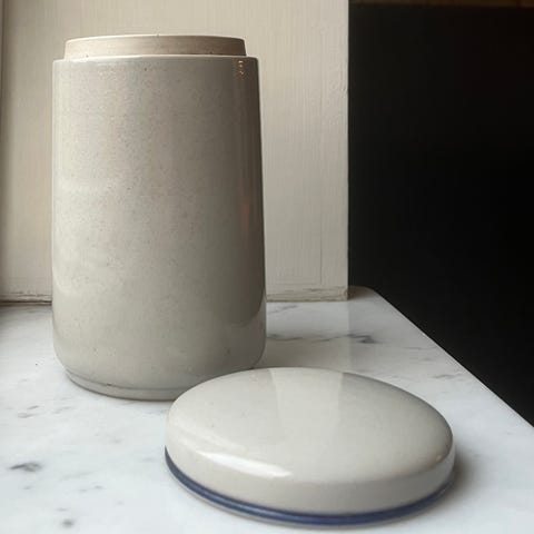 Hjorth stentøjs krukke med låg, Bornholmsk keramik. Se foto for signatur og nummer.