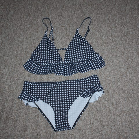 Badetøj, Bikini-sæt m bøjle, overdel str c 44 og underdel str c 42/44. Sort m dyreprint. 80% polamid og 20 % elastan. God men brugt. Kan afhentes i Rødovre, Ølstykke eller sendes hvis køber betaler portoen.