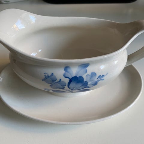 Fajance, Sauce skål, Fattigmands blå blomst, Så fin til alle julens saucer og geniale med det faste underfad, som sikrer dugen imod spild.