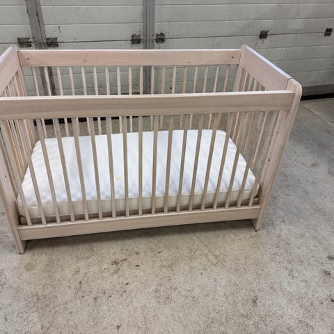 Tremmeseng, b: 65 l: 120, Pæn seng i lakeret bøg, front kan sænkes.
