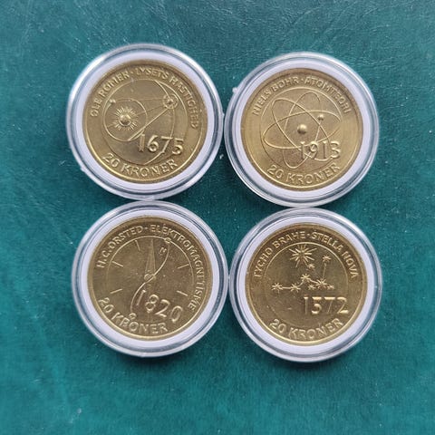 Videnskabsmønter: Tycho Brahe, H. C. Ørsted, Niels Bohr og Ole Rømer (alle fire udgivne videnskabsmønter).