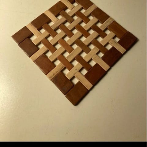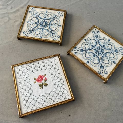 Træplade broderet syet med bast bastbånd her i hvid gul lilla lyserød grøn bånd bast