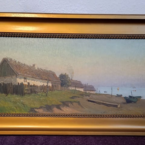 Olie maleri af Odense Gastårn. ca. 1940. Ewald Petersen var odenseansk maler (f.1900) og malede motiver fra byen, haven, Odense mv. Maleriet har været i eje af Grosserer A. Østergaard A/S frem til 1996. Bruun larsen vurdering kr. 1800
