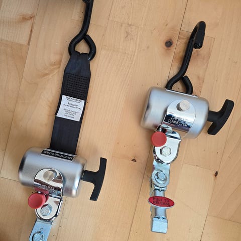 Andet biltilbehør, Unwin, Kørestolsbespændinger, bagerste spænder til 3-punkts bespænding ubrugte samt et sæt brugte sælges samlet 1000 kr