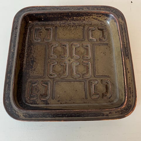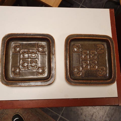 Keramik, Valdemar Petersen, Fad fra B&G af Valdemar Petersen. Nr 7233. Det mørke er ældst. Det lyse har et chip på siden af faddet. Det mørke kr 175 og det lyse kr 100.