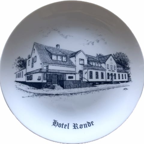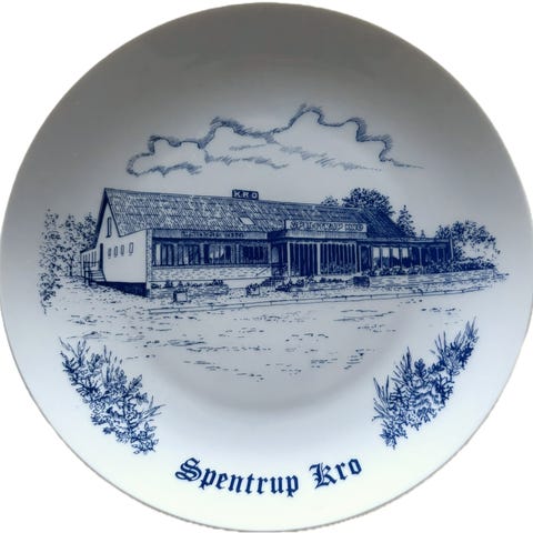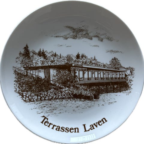 Flot hvid platte fra danske Corell Porcelæn, som viser den kendte Restaurant Varna i Århus.
