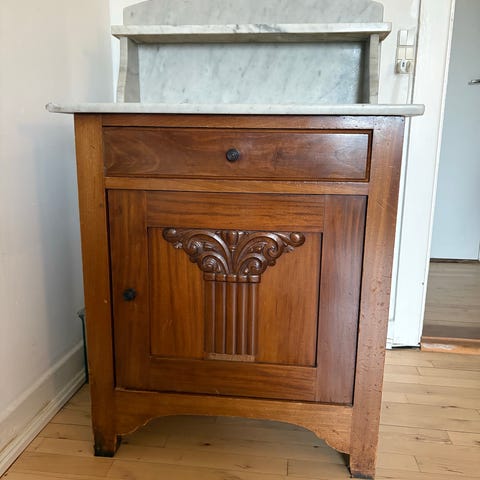 Skabet har været brugt som et natbord, indeholdende de vigtigste fornødenheder i forbindelse med blive vasket i hovedet om morgnen...
