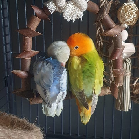 De “bor” i deres bur i vores køkken-alrum så de er vant til at være med der hvor vi er de er ofte ude af deres bur og hygger sig med at gå på spise bordet.