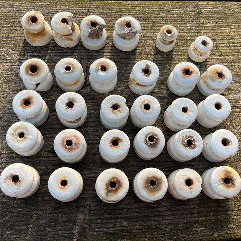 Porcelæns isolator, Hegnsknopper isolator i porcelæn. Mindste 50 år gamle da de er fra et nedlagt landbrug hvor de sidste indhejning var i slut 60'erne. Lidt rust, slitage og skidt der ikke kan fjernes.