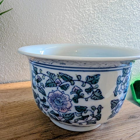 Urtepotteskjuler m/kinesisk motiv, 7,3 cm høj 12,5 cm i diameter.