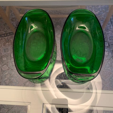 Fransk vintage assiette i pressemønster med stjerne i bunden. Solid udførelse med fine afrundede kanter og en god dybde. Den måler 13 x 20 cm, er 5 cm høj og vejer 419 g. Flot stand uden brugsspor, den er født med en lille støbningsfejl i bunden af glasset.