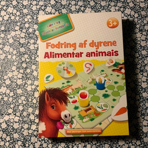 Hvad spiser dyrene, børnespil / MEMO, huskespil, 28 træbrikker i en træ-æske. Par brikkerne to og to, så mad og dyr passer sammen.
